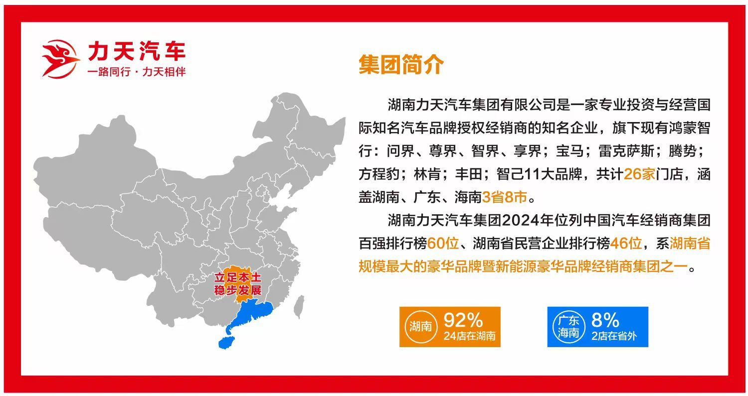 湖南力天汽車(chē)集團(tuán)有限公司是一家專業(yè)投資與經(jīng)營(yíng)國(guó)際知名汽車(chē)品牌授權(quán)經(jīng)銷(xiāo)商的知名企業(yè),旗下現(xiàn)有鴻蒙智行:?jiǎn)柦纭⒆鸾?、智界、享界;寶馬;雷克薩斯;騰勢(shì);方程豹;林肯;豐田;智已11大品牌,共計(jì)26家門(mén)店,涵蓋湖南、廣東、海南3省8市。