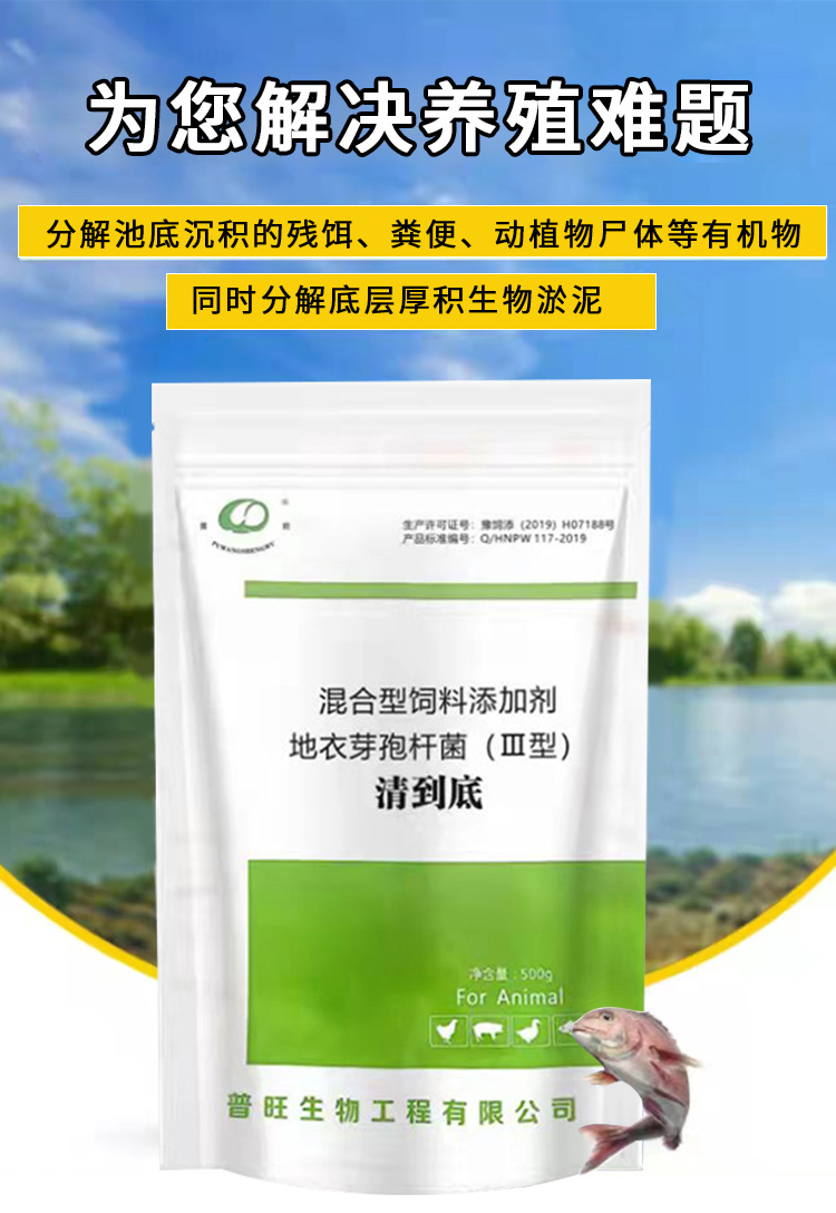 產(chǎn)品簡介:普旺生物水產(chǎn)藥清到底 改底調(diào)水增氧除臭分解淤泥混合型飼料添加劑-地衣芽孢桿菌 分解池底沉積的殘餌、糞便、動植物尸體等有機物,同時分解底層厚積 生物淤泥。生物改底幫你解決難題。